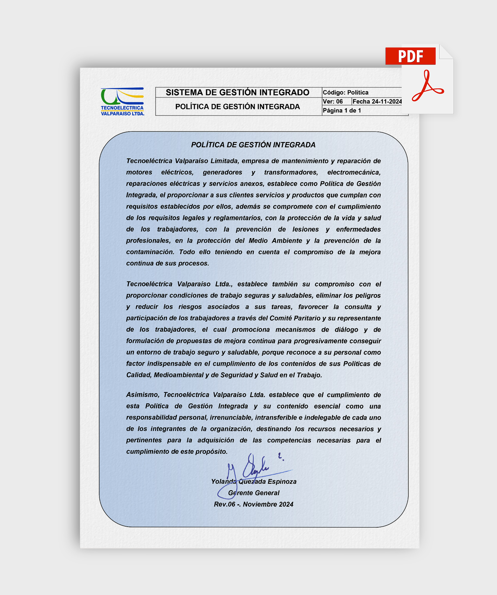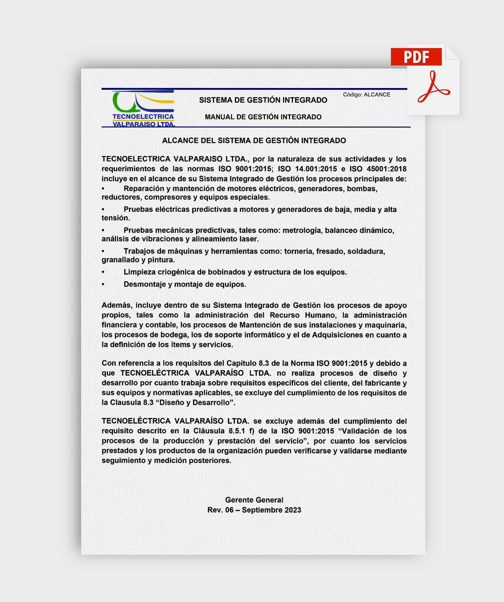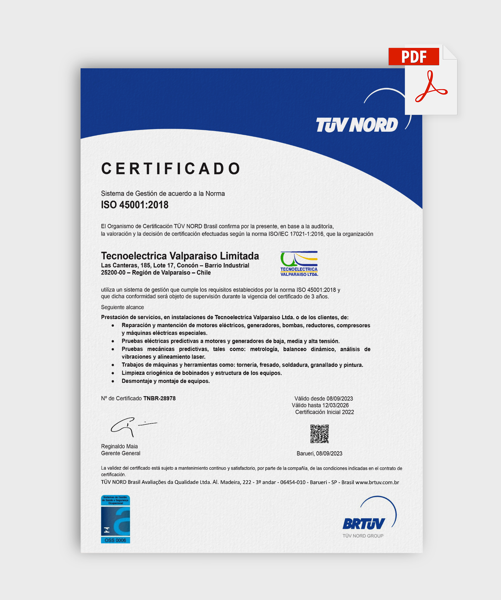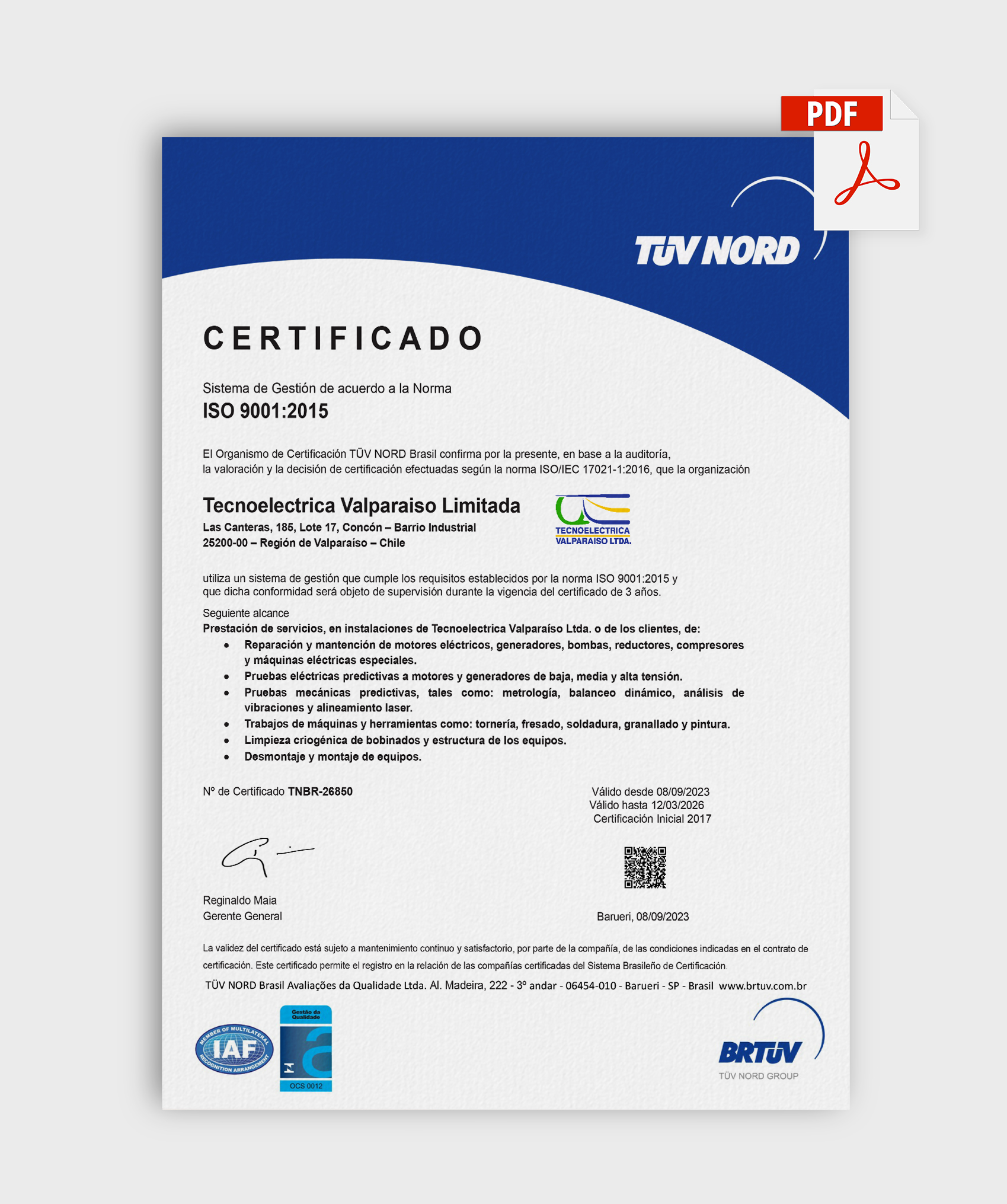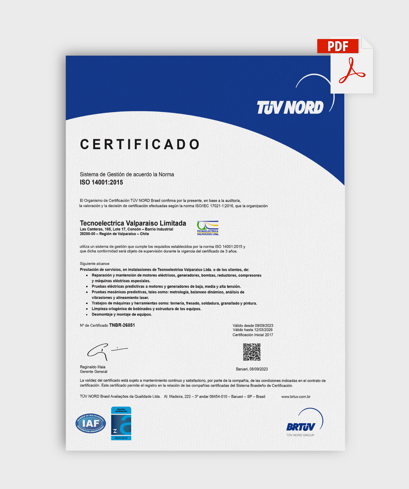 Tecnoeléctrica Valparaíso Limitada cuenta con diversas certificaciones nacionales e internacionales que garantizan la calidad, seguridad y eficiencia de sus servicios. Estas acreditaciones respaldan su compromiso con la mejora continua, el cumplimiento normativo y la adopción de estándares reconocidos en el ámbito eléctrico y tecnológico.