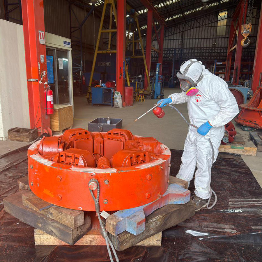 El área de pintura es la última escala en el proceso de reparación de bombas y motores. Juan Cabrera y Jaime Álvarez son los trabajadores a cargo de esta importante labor en Tecnoeléctrica Valparaíso Ltda. No se trata sólo de pintura, explica Álvarez, sino de un tratamiento integral. Reconstruyen la superficie con masilla mágica, anticorrosivo y lijado. Para las terminaciones se usan pinturas de poliuretano y epóxicas, en motores que laboran en condiciones extremas de acidez y humedad. Consiste en una capa gruesa, que le proporciona al equipo una mayor durabilidad. Se aplica con una pistola de aire por cañería. Asimismo, Cabrera y Álvarez se ocupan del barnizado de las bobinas, una vez terminada la reparación. Cuando el tiempo apremia, se utiliza un horno a 70° Celcius para secar la pintura y a la vez no afectar la grasa de los rodamientos (es la temperatura justa).